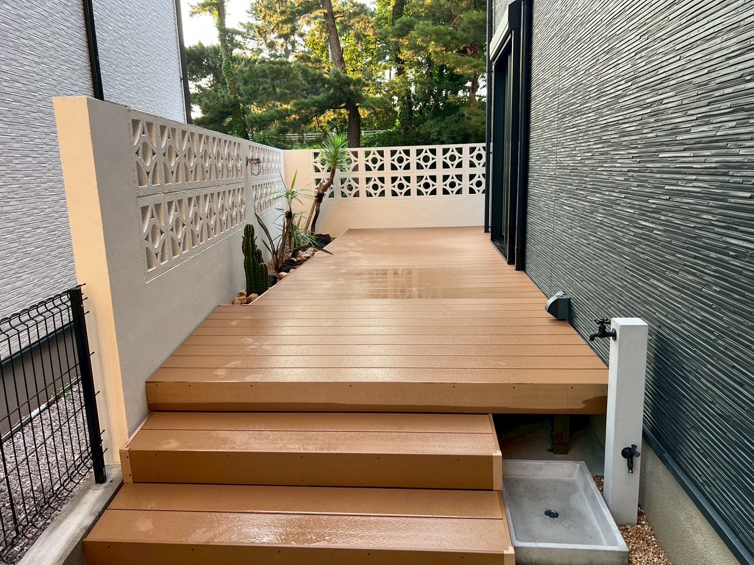 ウッドデッキを施工しプライベート空間が守られるように植栽スペースを。