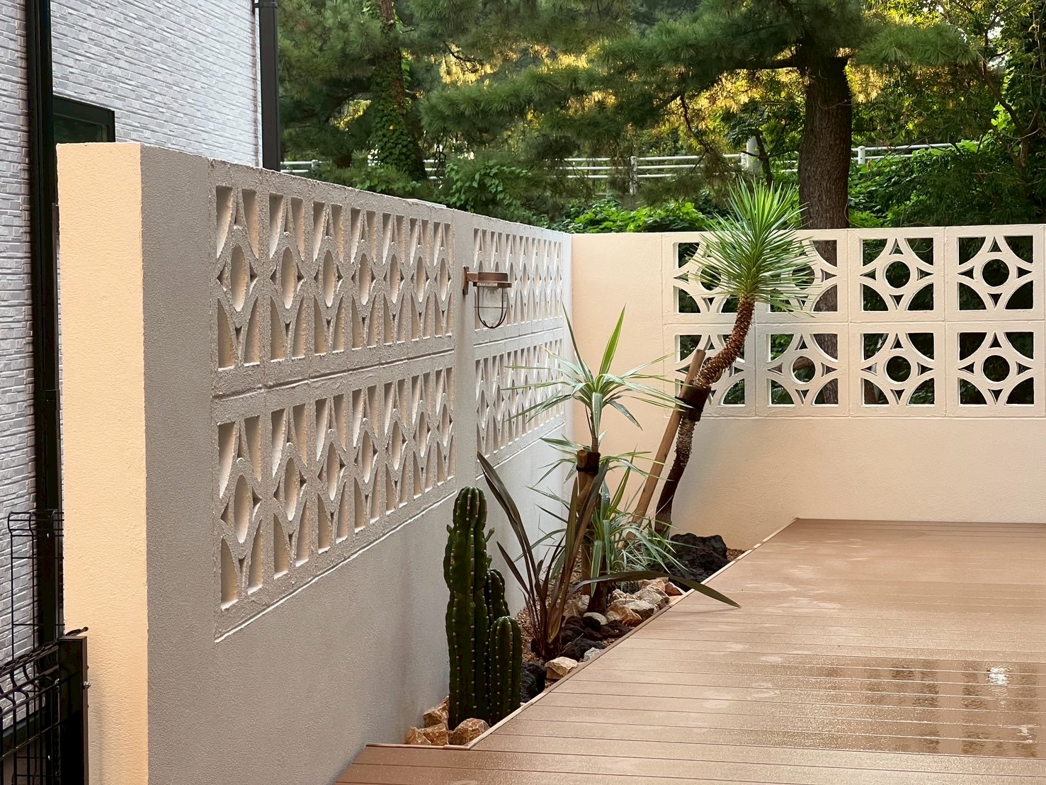 圧迫感がないように花ブロックを使っての目隠し。ブロックは塗装し明るさをUP